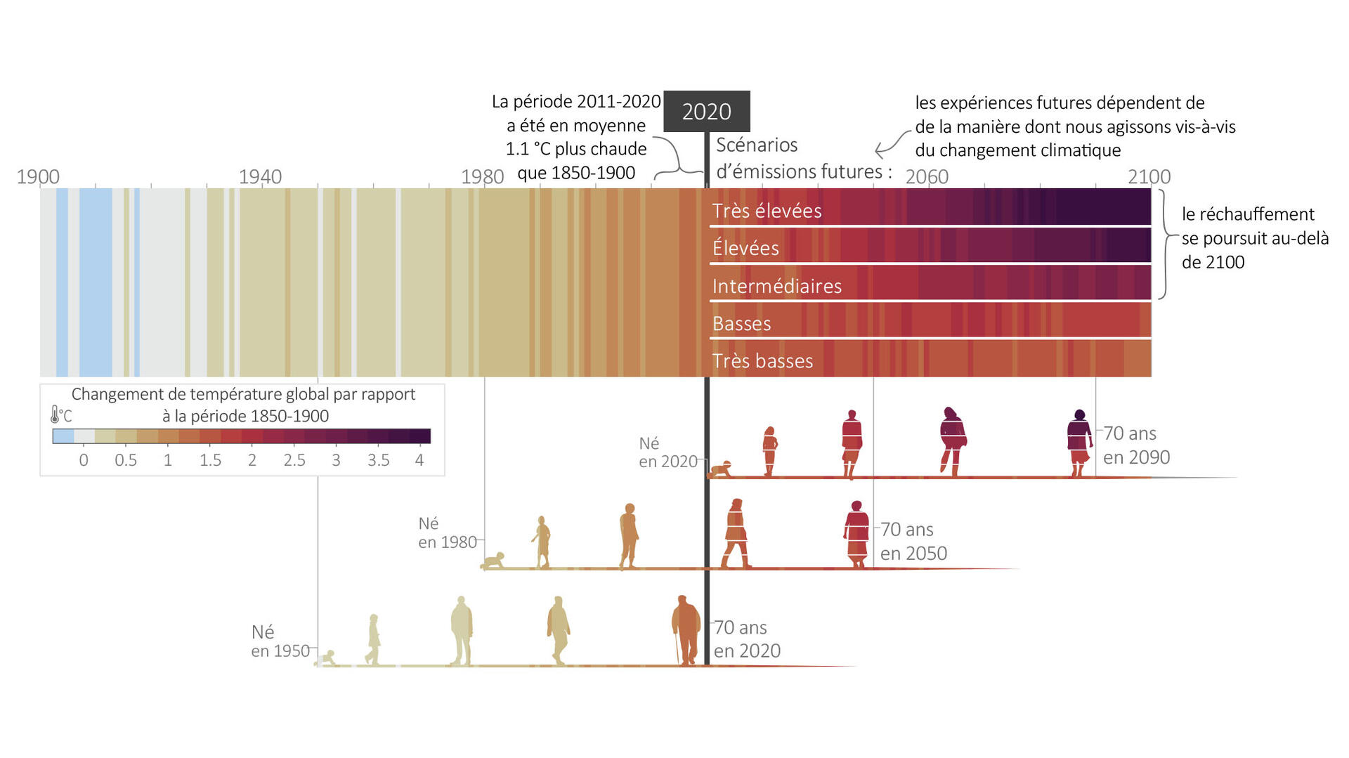 Ainsi, les choix d'aujourd'hui auront des conséquences sur les générations actuelles et futures comme le résume la frise ci-dessous établie par le GIEC (Groupe d'experts intergouvernemental sur l’évolution du climat).