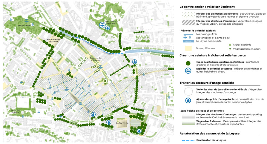 Ainsi, plusieurs sites du centre ont été identifiés comme des leviers pour recréer des axes de biodiversité et rafraîchir la ville, notamment à travers des cheminements piétons agréables en été. L’objectif est ainsi de créer une « ceinture verte », faite de lieux de fraîcheur, de continuités végétales et de sols perméables.