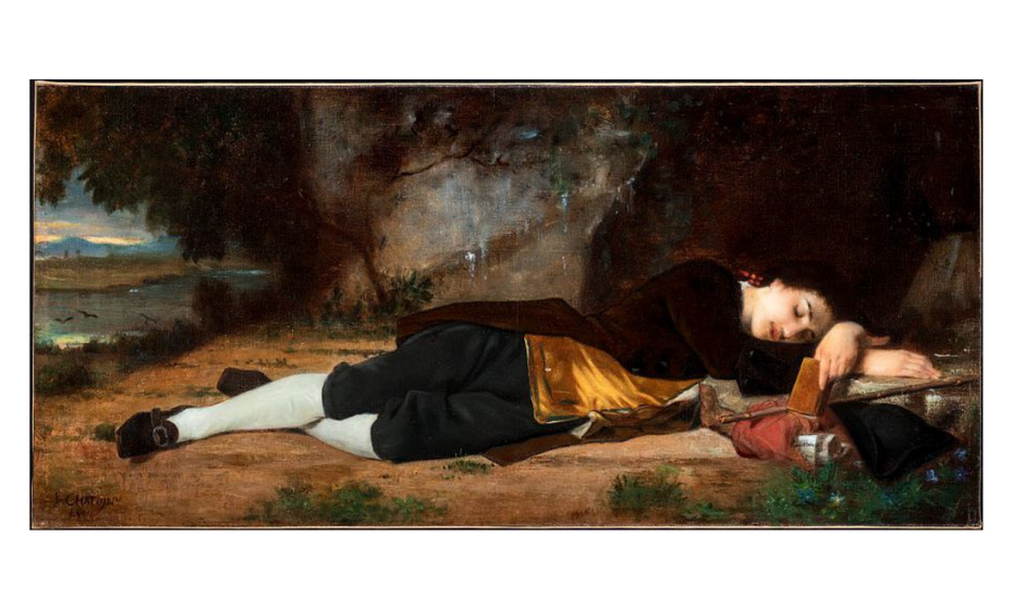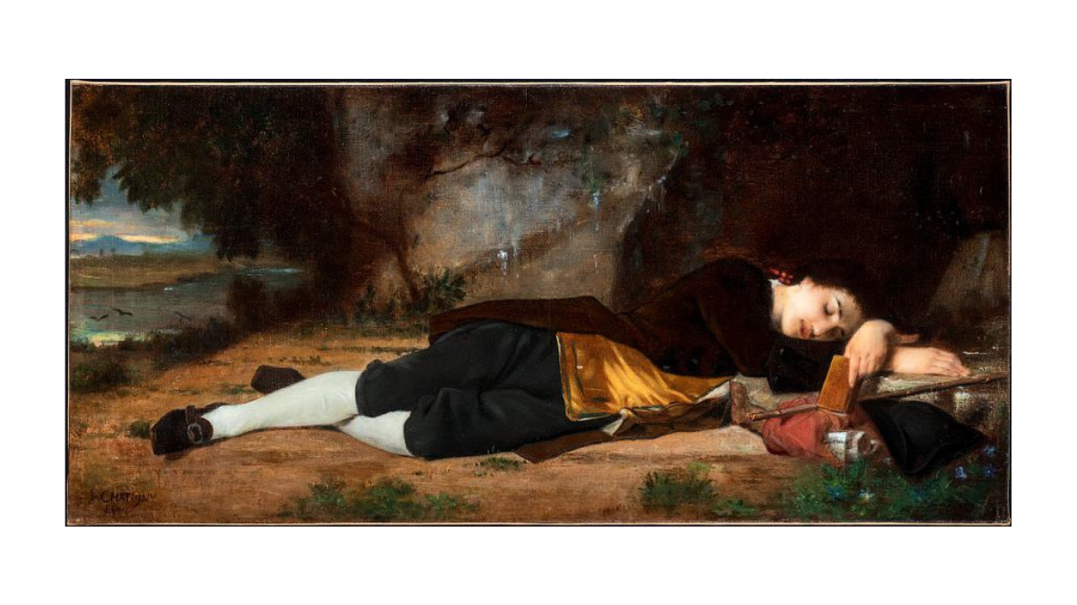 Musée Marmottan Monet (Paris) : « L’empire du sommeil », du 9 octobre 2025 au 1er mars 2026 / Jean-Baptiste Chatigny, Jean-Jacques Rousseau endormi dans la grotte des Etroits à Lyon, vers 1877, huile sur toile, inv. 2021.1.1