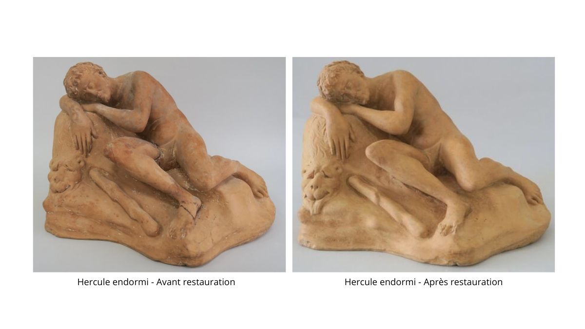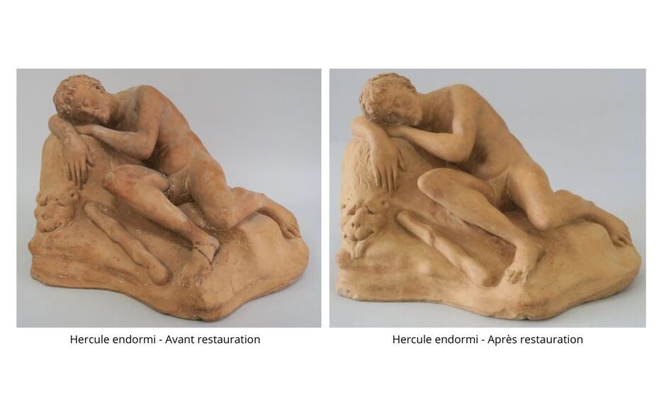 La restauration a consisté à un dépoussiérage et décrassage des surfaces. Les cassures ont été débarrassées de leurs anciens collages afin de réaligner et recoller correctement les différentes parties de la sculpture. Cette opération est permise grâce aux matériaux réversibles qui est l’un des principes de base de restauration : le fait de pouvoir revenir à un état ultérieur. Les lignes de fracture ont été comblées, puis des retouches d’harmonisation ont été effectuées, tant sur ces comblements que sur les restes de préparation blanche, pour restituer un ensemble plus cohérent et lisible.