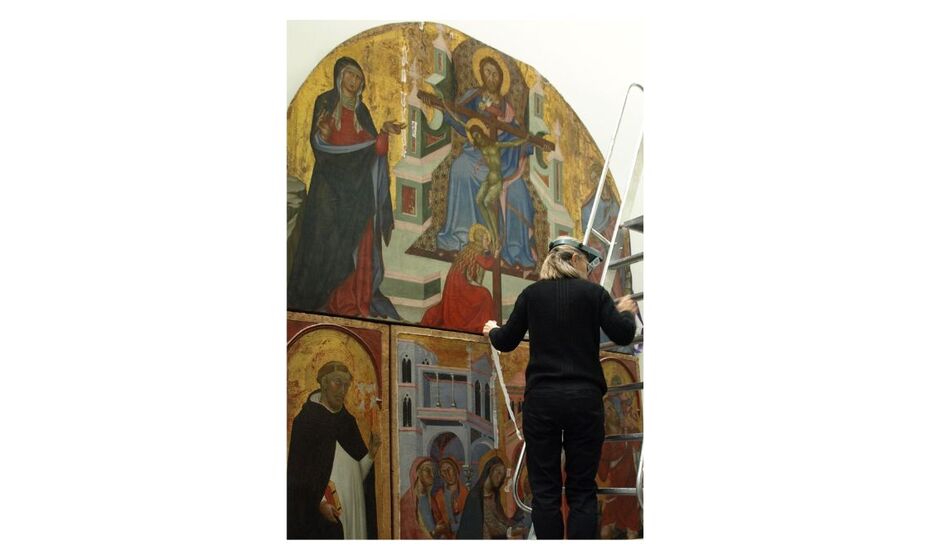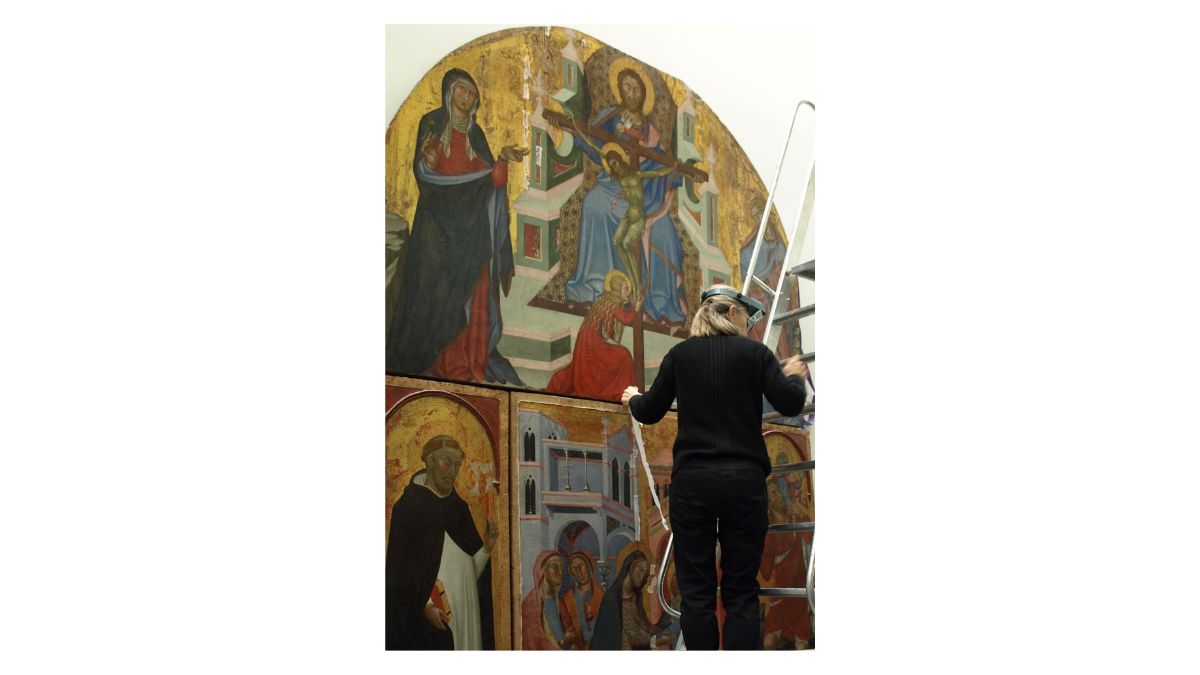 Contrairement aux autres restaurations présentées, qui ont été réalisées en atelier, l’intervention sur le Retable de la Trinité s’est déroulée directement dans les salles du musée. La fragilité, la taille et le poids de l’œuvre ne permettaient pas son transport jusqu’à l’atelier des restaurateurs.