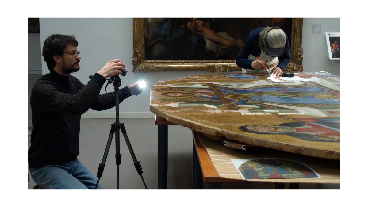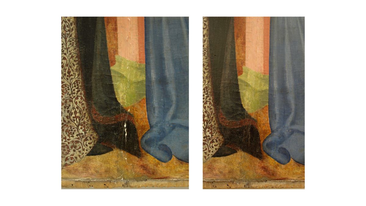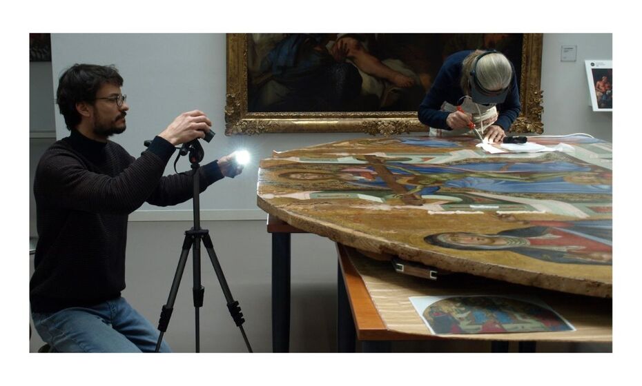 Cette opération a également permis d’approfondir l’étude de l’œuvre. Les restaurateurs ont observé et répertorié les poinçons décoratifs utilisés sur les parties dorées : une dizaine de motifs distincts ont été identifiés, certains combinés pour en créer de nouveaux. Cette analyse enrichit l’histoire matérielle du retable et suggère un rapprochement avec certains poinçons employés par Pietro Lorenzetti.