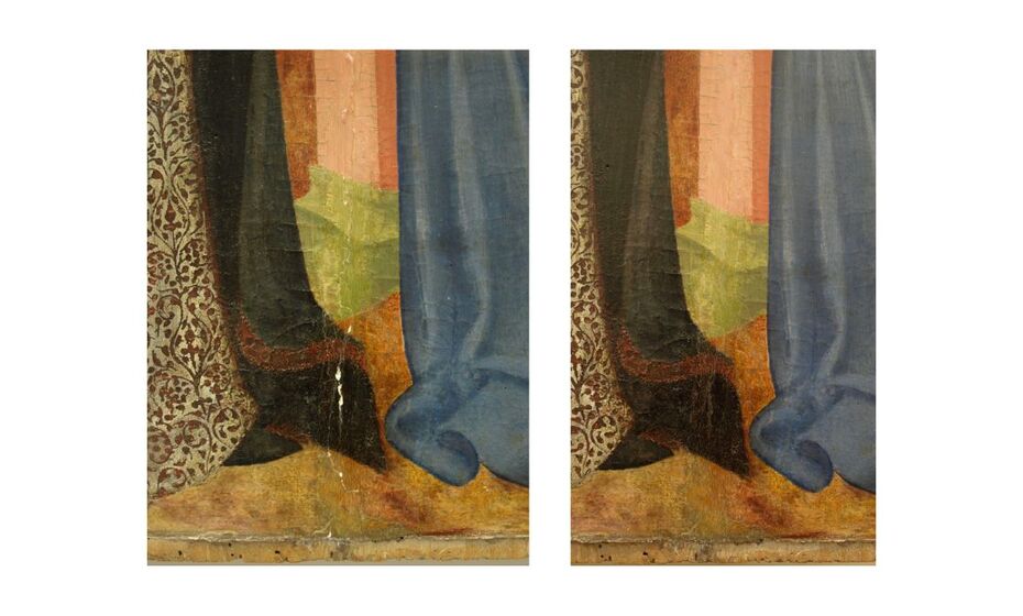 L’équipe de restauration a d’abord sécurisé les zones fragiles en collant des papiers japonais (facing), avant de décrocher l’œuvre et de la mettre à plat. Les soulèvements ont été refixés et les lacunes comblées. Les mastics ont ensuite été retouchés selon la technique du tratteggio : de fines lignes verticales et parallèles qui restituent l’unité visuelle tout en restant distinctes de la peinture d’origine. Ce procédé répond à un principe fondamental de la restauration : la lisibilité, c’est-à-dire que l’intervention doit s’intégrer sans se dissimuler totalement.
