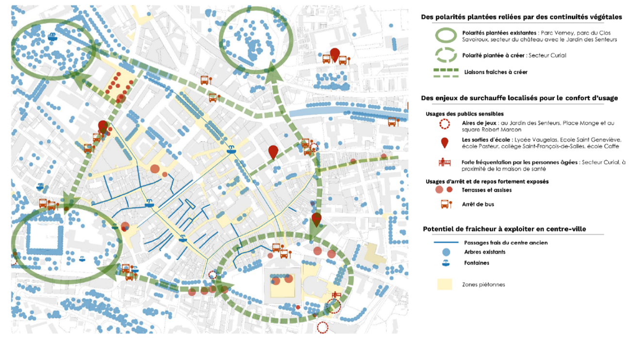 Ainsi, plusieurs sites du centre ont été identifiés comme des leviers pour recréer des axes de biodiversité et rafraîchir la ville, notamment à travers des cheminements piétons agréables en été. L’objectif est ainsi de créer une « ceinture verte », faite de lieux de fraîcheur, de continuités végétales et de sols perméables.