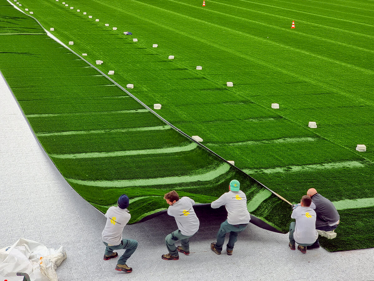 La pose de pelouse synthétique a marqué une étape importante dans le chantier de reconstruction du stade municipal de Chambéry. 9945m2 de pelouse ont été posés durant les 15 premiers jours du mois d'avril 2023 pour un montant global du terrain de jeu s’élevant à 990 000 € TTC.